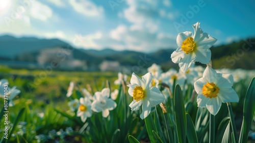 © Fotograf, Fototapeta premium Beautiful field of white and yellow flowers with majestic mountains in the background. Perfect for nature and landscape themed projects