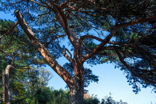 © Chongbum Thomas Park, Fototapeta premium Beautiful fine tree forest with blue sky.