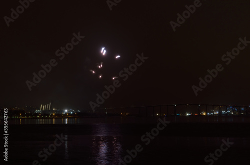 Obraz premium Beautiful firework on night sky in tromsoe city with bridge, cathedral and colorful reflection on the cold fjord water surface on new years eve