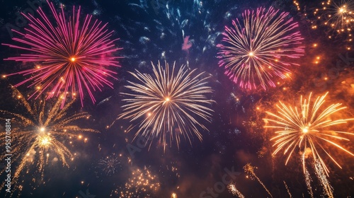 Naklejka premium Beautiful fireworks at night during a holiday. Fireworks exploding in the air full of lights and sparkle in celebration of the special day.