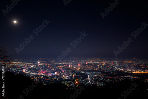 © Nattawat, Obraz premium Beautiful fireworks Happy New Year at Chiangmai City Thailand.