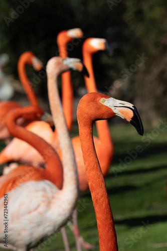© Maria de la Pe/a, Fototapeta premium beautiful flamingos with their pink plumage, yellow eyes and black beaks, in the park in the sun.