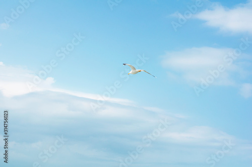 © Дмитрий Демьянов, Fototapeta premium beautiful flight of a seagull in the blue sky, on a clean background, close-up.