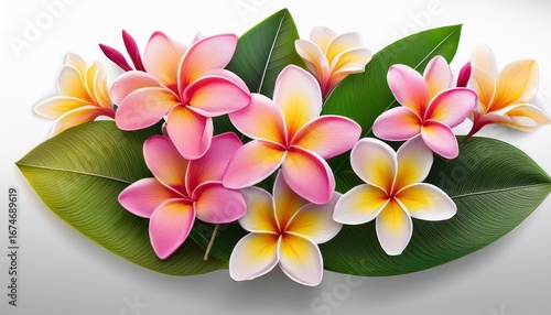 Naklejka premium beautiful floral arrangement featuring pink and yellow plumeria flowers with...