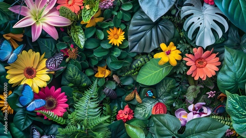© CREATIVE STOCK, Naklejka premium Beautiful floral background, panorama. Leaves, colorful flowers, caterpillars, butterflies