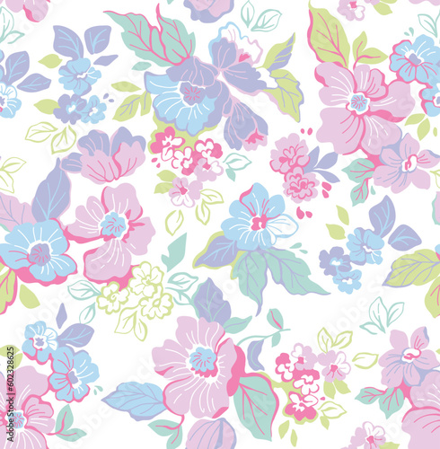 Obraz premium Beautiful floral pattern in small flowers. Delicate white flowers. White background. Liberty print. Floral seamless background. Trendy template for fashion prints. Stock pattern.