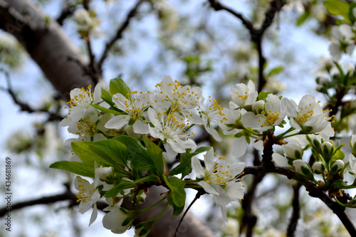 © bubushonok, Obraz premium Beautiful floral spring abstract background of nature. Plum tree. Prunus
