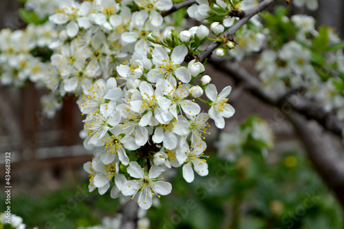 © bubushonok, Obraz premium Beautiful floral spring abstract background of nature. Plum tree. Prunus