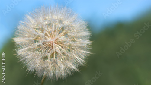 © Mariia, Fototapeta premium Beautiful flower dandelion on a background of clear blue sky. Close up of fluffy Dandelionon a blue background. Taraxacum Erythrospermum. Abstract nature background of Dandelion . Computer background.