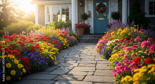Obraz premium Beautiful Flower Garden Pathway Leading to a Charming House.