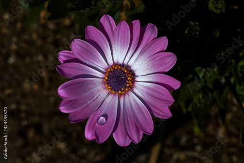 © Javier, Obraz premium Beautiful flower with purple and white petals, and a raindrop