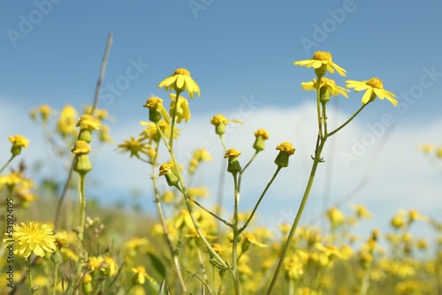 Obraz premium Beautiful flowers growing in meadow on sunny day