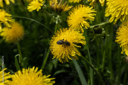 Fototapeta premium Beautiful flowers of yellow dandelions in nature in warm summer or spring on...