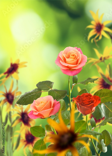 © cooperr, Obraz premium Beautiful flowers on a green background.