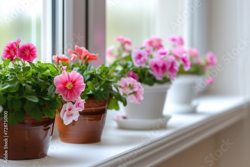 Obraz premium beautiful flowers on the windowsill near the window