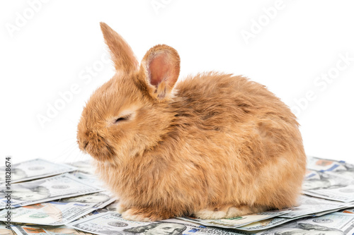 Fototapeta premium Beautiful fluffy red bunny lies on dollars with closed eyes, isolated on...