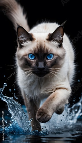 © mod, Fototapeta premium Beautiful Fluffy Siamese Cat with Striking Blue Eyes Running on Water Against a Black Background, Perfect for Animal Lovers and Cat Enthusiasts