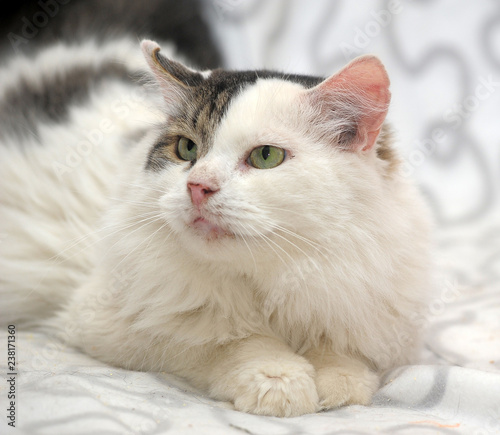 Fototapeta premium beautiful fluffy white with gray cat on the couch