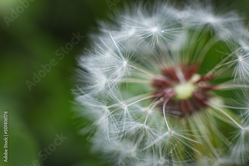 © TATIANA, Fototapeta premium Beautiful flying red ladybug with white dandelion fluffy. Macro shot. selective focus with copy space