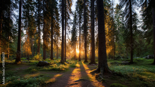 © ALA, Fototapeta premium Beautiful forest background for screensaver. with sunbeams. Calm close-up of fairytale forest and nature landscape, panorama. Summer vacation, holiday, amazing nature.