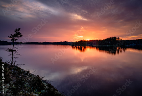 © Kilman Foto, Fototapeta premium beautiful forest lake sunset with some small plant in the foreground