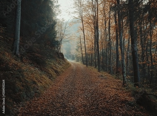 © nisi, Fototapeta premium Beautiful forest landscape in autumn with leaves on the ground and trees, with a dirt path leading through the forest. Stock photo contest winner, high resolution, in raw style.