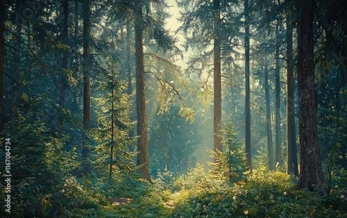 © Dzikrul Husnani, Obraz premium Beautiful forest landscape with sunlight shining through the trees in autumn. Forest path, natural background. High-resolution photo of a beautiful nature scene. Green pine and oak trees, bright color