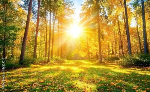 Obraz premium Beautiful forest landscape with trees and sunlight in autumn, a sunny day in...