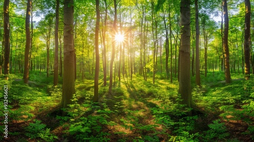 Obraz premium Beautiful forest panorama with bright sun shining through the trees , ai
