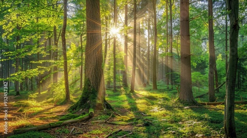 © Dzikrul Husnani, Obraz premium Beautiful forest panorama with bright sun shining through the trees , ai
