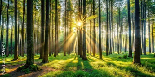 Obraz premium Beautiful forest panorama with large trees and bright sun , nature, landscape, scenery, trees, sunlight, outdoors