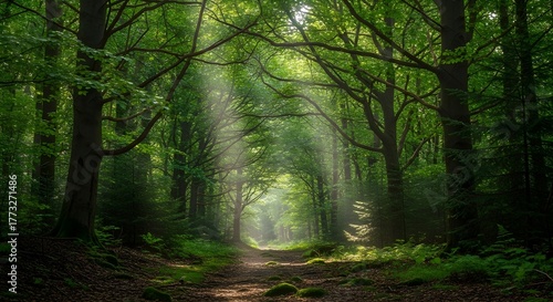 Fototapeta premium Beautiful forest with tall trees and sunlight beams filtering through branches jpeg image.
