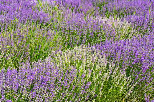 Naklejka premium Beautiful fragrant lavender flowers on the green plain behind the farm
