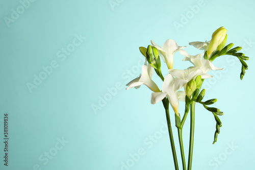 Fototapeta premium Beautiful freesia flowers on light blue background. Space for text