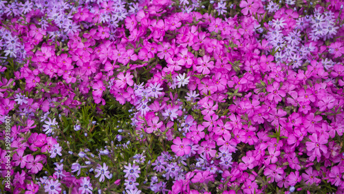 © Alekskan12, Naklejka premium Beautiful fresh flowers on a flower bed-floral background. Beautiful spring blooming phlox flowers