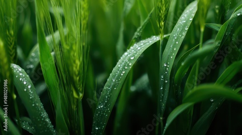 © jannik27s, Obraz premium Beautiful, fresh green grass with water droplets in close-up, blurred background
