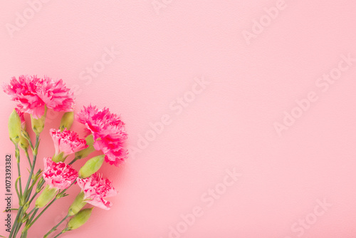 © fotoduets, Naklejka premium Beautiful fresh pink carnation flowers bouquet on light pink table background. Pastel color. Closeup. Congratulation concept. Empty place for text, quote or sayings. Top down view.