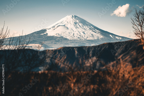 Naklejka premium Beautiful Fuji mountain with snow covered on the top in the winter season in Japan, Teal and Orange tone.