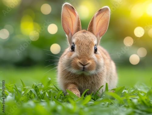 © Creative Journey, Obraz premium Beautiful Furry Easter Rabbit Bunny on Sunny Meadow. Bokeh Lights, Spring Garden, Traditional Easter Scene.