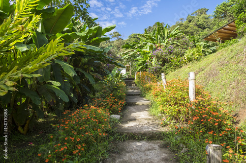 Naklejka premium Beautiful Garden Path Leading to a Cabin Surrounded by Lush Tropical Plants and Flowers on a Sunny Day