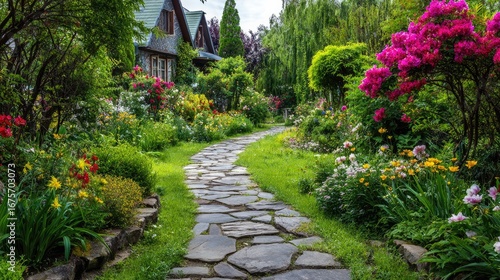 © Sampao, Fototapeta premium Beautiful Garden Pathway Surrounded by Colorful Flowers and Lush Greenery in a Residential Area