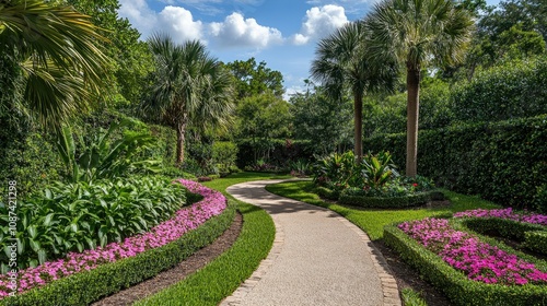 Obraz premium Beautiful Garden Pathway with Trimmed Flowers and Foliage