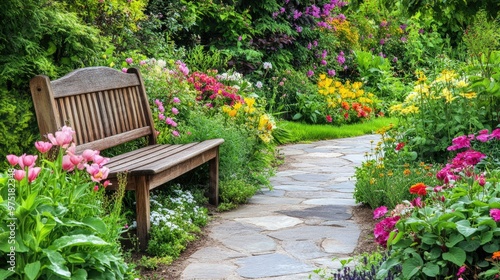 © Imron, Fototapeta premium Beautiful garden with blooming flowers a stone pathway