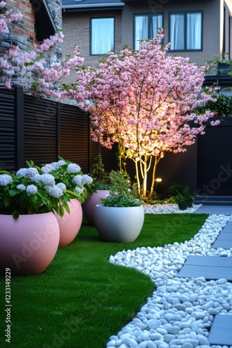 © gamespirit, Obraz premium Beautiful garden with pink flowering trees and modern planters showcasing vibrant landscaping at dusk in a residential backyard