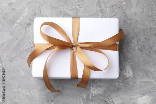 © New Africa, Naklejka premium Beautiful gift box on textured grey background, top view