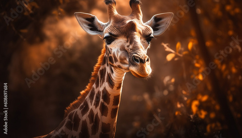 Obraz premium Beautiful giraffe standing in the African savannah, looking at camera generated by AI