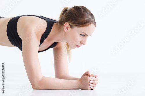 Fototapeta premium Beautiful girl athlete does exercise - plank