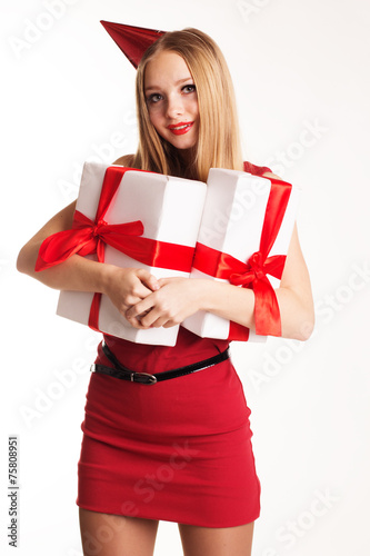 © _chupacabra_, Fototapeta premium Beautiful girl holding gift boxes, happy Birthday