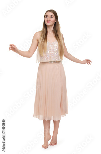 Naklejka premium Beautiful girl in beige skirt on white background