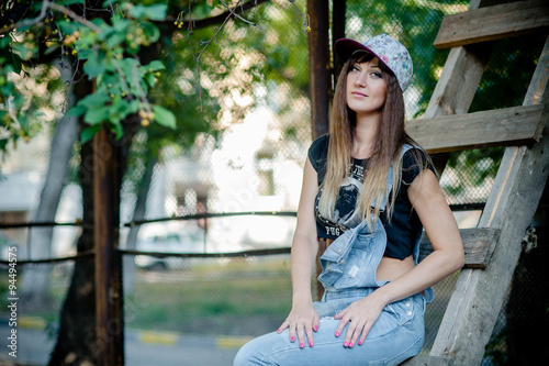 © frizza, Naklejka premium beautiful girl in denim overalls